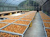我が家でも梅干し作業が始まりました。写真は青梅を漬け込んだタンクから梅干しを出し、軽く水洗いをしているところです。そして梅干用のハウスに梅干しを干します。写真は干して一日経過したところです。 |