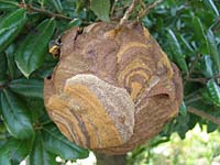 我が家の庭のウバメガシの木にスズメバチが巣を作りました。様子を見ていたのですが、ソフトボール位に巣の大きさになりハチも増えてきたので駆除することにしました。 |